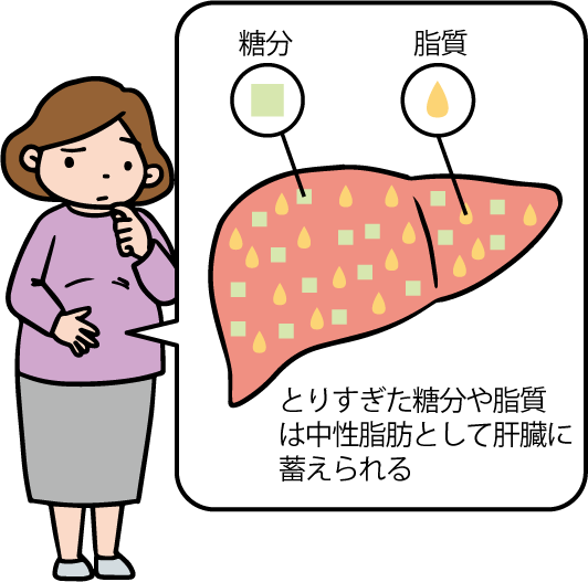 肝臓の病気の原因はお酒だけではありません。近年増加している脂肪肝は食べすぎが主な原因とされています。とくに糖分や脂質をとりすぎると肝臓に中性脂肪として蓄えられ、脂肪肝を招きます。また、日本人は皮下脂肪が溜まりづらく、肝臓に溜まりやすいため、太っていない人も脂肪肝に注意が必要です。