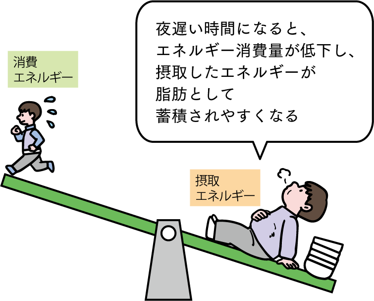 夜遅い時間は体が休息モードになって基礎代謝量が低下するため、食事で摂取したエネルギーは消費されにくく、肝臓に中性脂肪として蓄えられやすくなります。また、寝る直前の食事は睡眠の質の低下から、食欲をコントロールするホルモン分泌の乱れを招き、食べすぎや肥満の原因にもなります。