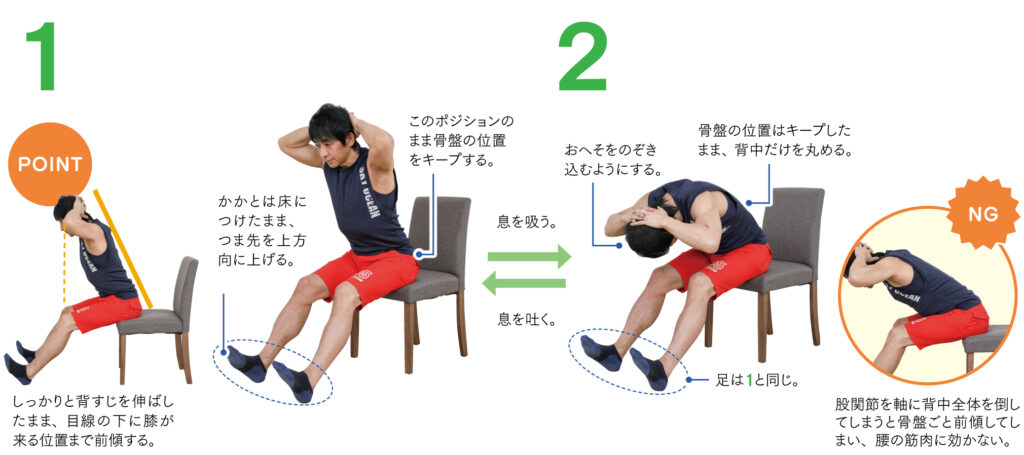1.イスに浅く座って両足を前に出し、膝を軽く曲げてかかとを床につけたら、両手を頭の後ろに組み、前傾する。