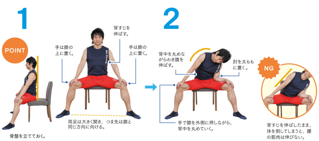 1.イスに浅く座って両足を大きく開き、両手を膝の上におく。
