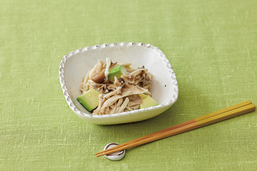 - しめじ、まいたけは小房に分ける。えのきは長さを半分に切り、ほぐす。アボカドは一口大に切る。